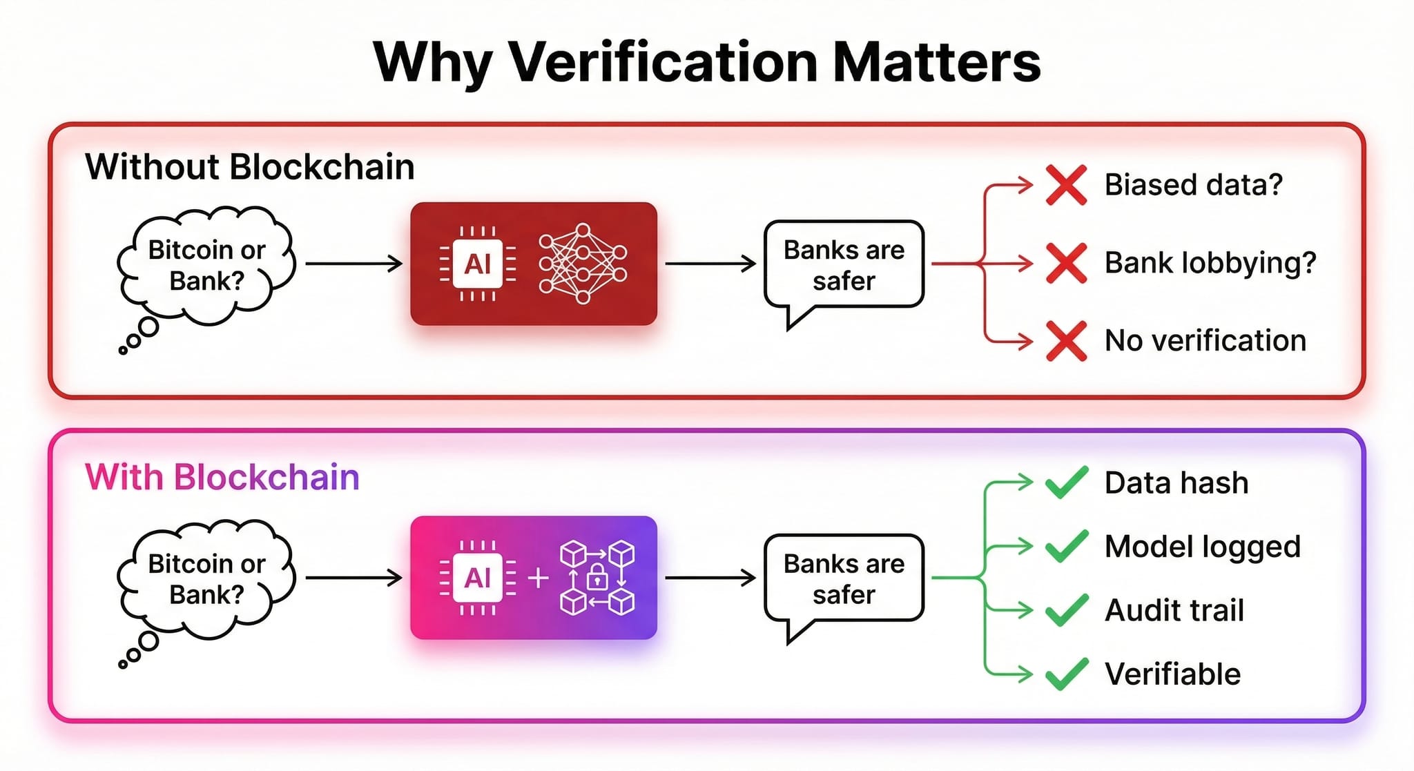 With blockchain verification: You could audit what data the AI used, see if the training data was biased, and verify the reasoning. You'd know if you were getting real analysis or institutional propaganda.