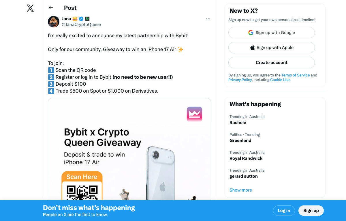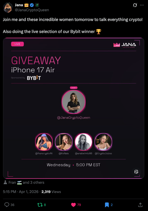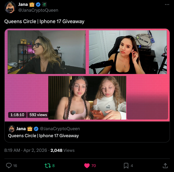 Jana leads every campaign from brief to wrap. The Queens Circle is her hand-picked creator network, built over four years across the US, EU, APAC and LatAm — every creator crypto-native, every voice trusted, no pay-to-shill energy.